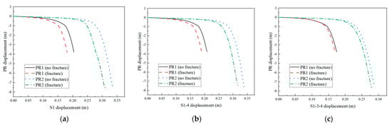 Vertical displacement of RP1 and RP2 with different moving supports: (a) Case 1 and 1′; (b) Case 7 and 7′; (c) Case 13 and 13′.