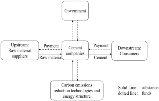 Based on the above-mentioned theory of company competitiveness, we further explored the various roles and processes in the production and trading of cement companies, forming the logical basis of the model structure. As shown in Figure 1, upstream suppliers provide raw materials, such as limestone, clay, and cement additives to the cement company, where cement is produced through raw material grinding, clinker calcination, and cement grinding. The company then sells the product to downstream consumers and makes a profit. The levels of emission-reduction technologies and energy structure largely determine carbon emissions. Under the government’s strict carbon-trading scheme, cement companies receive free quotas for the current year, calculated based on production and an established benchmark. If the annual carbon emissions exceed the quota, a company will be required to purchase carbon credits on the carbon trading market, and if there is any surplus, sell the remainder on the market. To reduce carbon intensity and reach a target close to or below the benchmark value, a cement company would invest in more emission-reducing equipment and cleaner energy. If the carbon emission intensity of a cement company reaches an advanced level in the industry, the government will also provide carbon emission-reduction incentives.