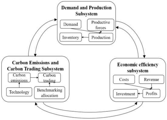Three subsystems were defined to build a system dynamics model based on the relationships between cement companies and other stakeholders: the demand and production subsystem, the economic efficiency subsystem, and the carbon emission and carbon trading subsystem. As shown in Figure 2, the three subsystems are closely related. The demand and production of cement largely control a company’s carbon emissions. The amount of carbon trading determined by carbon emissions and benchmark value influences economic efficiency. The improvement in economic efficiency and expansion of scale would motivate companies to develop new energy strategies, invest in carbon emission-reduction technologies to reduce carbon trading costs, and continuously enhance production levels.