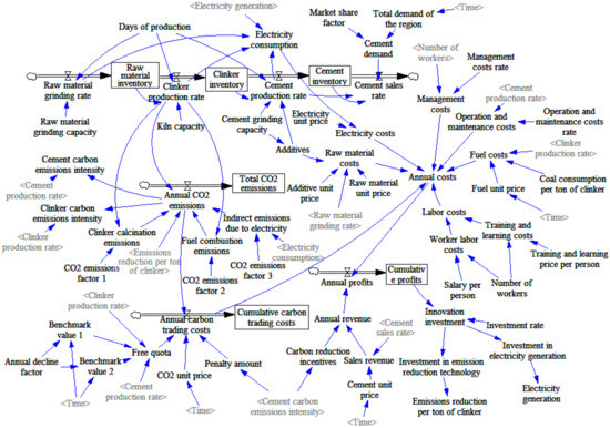 Based on the system conceptualization, the stock-flow diagram that determines the quantitative relationship between variables was established, as shown in Figure 4. It shows multiple feedback loops. For example, the profits gained by a company would continue to be invested in enhancing carbon emission-reduction capacity and improving energy structure, which will eventually be reflected in the total cost and revenue after cement production and sales. This is a positive feedback loop. Moreover, due to the rapid rise in carbon prices, a company would set the expected carbon intensity according to the industry benchmark level and relevant government policy texts in response to the rising carbon emission trading costs. The larger the gap between the expected and actual carbon intensities, the more a company will increase its investment in innovation to decrease this gap for cleaner production. This is a negative feedback loop.