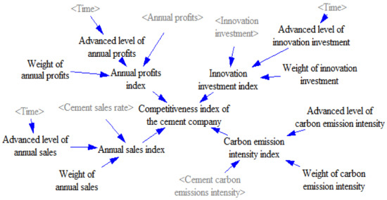 A competitiveness index for the cement company was constructed to study the impact of profits, sales, carbon emission intensity, and innovation investment on competitiveness. As shown in Figure 5, the annual profits index, annual sales index, carbon emission intensity index, and innovation investment index were determined by the company’s own level, the advanced level of the industry, and the weight of each index. The advanced level of the industry was determined according to the levels of the leading cement companies. The weights of individual competitiveness indexes refer to Gao [53] (Table 1). Then individual indexes were normalized the competitiveness index calculated.