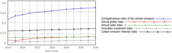 Firstly, the simulation results under the baseline scenario are shown in Figure 6. According to the definition of the competitiveness index, the larger the competitiveness index, the closer to 1, the stronger the competitiveness of a cement company. From Figure 6, it can be seen that there is an increase in the competitiveness index over time due to the implementation of carbon trading policies. This means that benchmark allocation has a positive impact on the competitiveness of cement companies. Specifically, there is no significant change in the annual sales index. The annual profits index decreases in the first year and maintains an increasing trend in 2019–2024. It contributes significantly to the growth of the competitiveness index by 2024. After 2024, the innovation investment index and the carbon emissions intensity index show a slight upward trend. The growth of the competitiveness index in this period is mainly due to these two indexes, although they rise slowly.