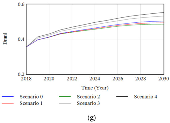 Figure 7a–g show the simulation results of the first and second sets of scenarios. The annual profits, annual costs, emission reduction per ton of clinker, annual CO2 emissions, annual carbon trading costs, innovation investment, and competitiveness index under Scenarios 1–4 were presented and compared with the baseline scenario. In all scenarios, annual costs trend upward as raw material and fuel prices rise (Figure 7b). Annual profits trend upward until 2027, and then appear to have a downward trend (Figure 7a). The main reason is that the demand for cement decreases after 2027, resulting in lower annual sales and annual revenue.