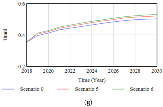 The plots in Figure 8a–g show the simulation results of seven indicators from the third set of experiments under the combined scenarios, compared with the baseline scenario. Scenario 5 is the scenario in which the annual decline factor of the benchmark value and innovation investment rate adjust simultaneously but to a smaller extent than in Scenario 6. The curves representing Scenario 5 all lie between the other two curves representing the baseline scenario and Scenario 6 (Figure 8a–g). In particular, it can be seen from Figure 8e that the annual carbon trading costs tend to stabilize after 2022 under this scenario. This is because with the innovation investment rate of 1.8% and the annual decline factor of 0.97, the reduction in carbon emissions due to emerging technologies is approximately the same as the reduction in carbon quota due to the decrease in the benchmark value. In this case, the annual carbon trading costs would not fluctuate too much, which provides cement companies with some time to adapt to new environmental policies. This is another reason why an annual decline factor of 0.97–0.99 is appropriate.