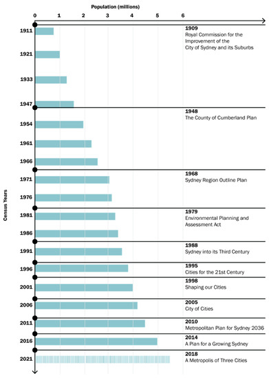 - Greater Sydney Commission. Past, Present and Future. Available online: https://www.greater.sydney/content/past-present-and-future (accessed on 11 June 2022).