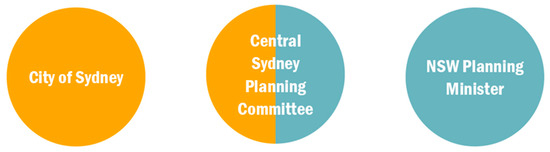 While the Environmental Planning and Assessment Act 1979 (EPAA) is still the backbone of the current NSW planning framework, a series of planning reforms have happened since, redirecting much planning power from the local government to the state [6,14,15]. As a result of this centralization of planning power, there are now three types of consent authorities in CoS: the City Council, Central Sydney Planning Committee (CSPC) and the NSW Planning Minister. The CSPC is composed of half Council and half State representatives, consisting of the Lord Mayor of Sydney, two CoS councillors, and four experts appointed by the NSW Planning Minister [16]. Figure 2 explains this power distribution with blue representing State power and orange representing Council power.