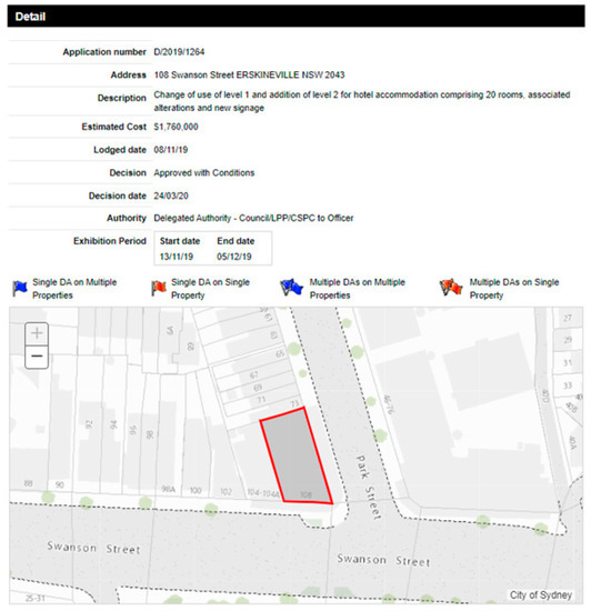 Publicly available datasets were analyzed in this study. This data can be found here: https://online2.cityofsydney.nsw.gov.au/DA, accessed on 3 May 2021.