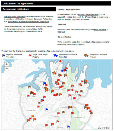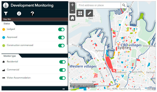 Snapshot of Development Monitoring interactive map (https://cityofsydney.maps.arcgis.com/apps/webappviewer/index.html?id=ab67ecb8c37f4ae38ac77066e02b03fe, accessed on 3 May 2021).