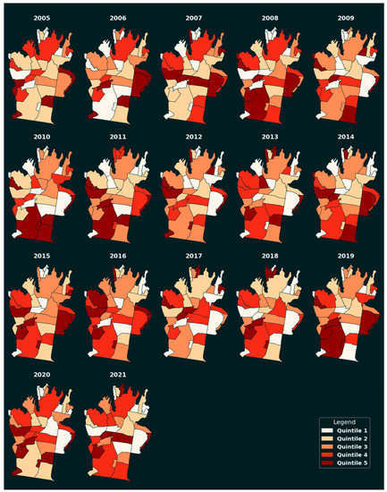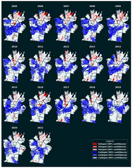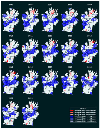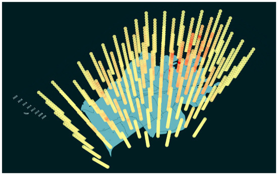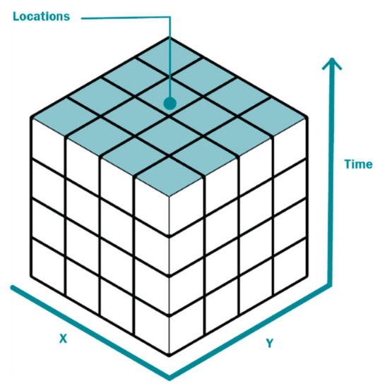 - ESRI. How Create Spaces Time Cube Works. Available online: https://pro.arcgis.com/en/pro-app/latest/tool-reference/space-time-pattern-mining/learnmorecreatecube.htm (accessed on 6 August 2021).