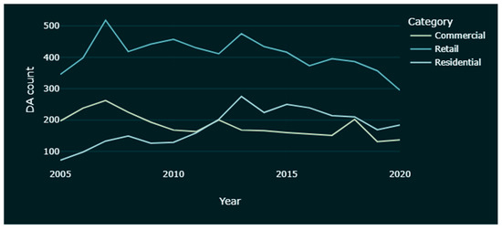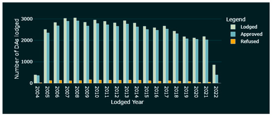 As noted earlier in this paper, CoS DA information is currently available online from November 2004 onwards, limiting the scope of this study. Some of the older DA records (called Building Application or BA in earlier times) can be found at the CoS Archives & History Resources, where records assessed as being of permanent value are kept [62]. These records currently have limited information and there is no automated way to download the full list of such applications. Once these older DA records are better digitised, they can be used to expand the study scope to provide a fuller review of the Sydney development history.
