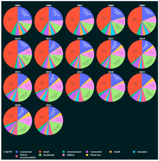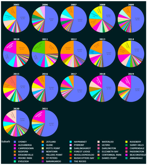 A major event that happened towards the end of the study period is COVID-19. On 11 March 2020, the World Health Organization (WHO) officially declared the coronavirus a global pandemic [29]. This major disruption has speeded up long term city transformations such as digitalization, a move to remote working and online services, and created a wide range of other side effects [30,31,32]. The changes in lifestyles and movement patterns have had different degrees of impact on different localities [33]. On a grander scale, projected population growth might be impacted, as net overseas immigration has been a main contributor to Sydney’s population growth for many decades [1,34,35,36]. All of the above shifts are likely to translate to changes in development patterns over time [1,35].