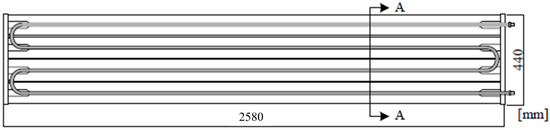 Figure 1 shows the office floor plan. The office area was approximately 108 m2, and the ceiling height was 3 m. The east wall was an external wall with 60% window coverage, while the other three walls were all internal walls that were adjacent to corridors, warehouses, and other non-air-conditioned rooms. No insulation measures were applied to the floor. Table 1 lists the thermal performance parameters of the envelope structure. The radiant panel area accounted for 40% of the total ceiling area. The radiant unit used is shown in Figure 2, and the size of the panel was 440 mm × 2850 mm. The radiant plate was a metal plate, and the coil was a three-layer metal tube covered with polyethylene.