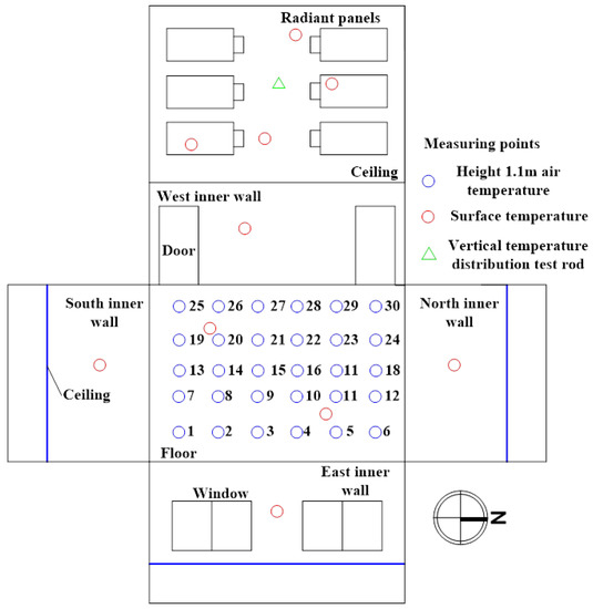 Figure 3 shows the layout of the measuring points in the six-sided office, and OMEGA’s T-type thermocouples are used for temperature measurement. A total of 25 temperature measuring points with a height of 1.1 m were used to test the horizontal temperature distribution. A temperature test rod was arranged in the center of the office to test the vertical temperature distribution. From 0 m, one measuring point was arranged every 0.5 m, for a total of 7 measuring points. There were also some other measuring points for testing the surface temperature of walls and other enclosures.