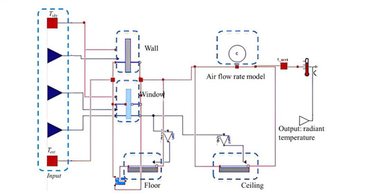 We used basic building components under the OpenModelica platform to create wall, window, air, and floor modules. The air module considered the interior space of the entire building as a whole, separated from the outside world by walls and windows, and considered the heat storage capacity of the indoor air. Simultaneously, a ventilation rate parameter was introduced to consider the effects of air infiltration and natural ventilation. Finally, by assembling the modules, a simplified numerical model was obtained, as shown in Figure 6.