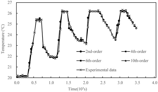 In general, it was difficult to determine the optimal reduction order of the reduced-order model, because this parameter is related to the frequency of excitation and type of building. In this study, the second, fourth, sixth, and tenth orders were selected as the comparison objects, and the calculation results were compared with the indoor temperature measured at No. 15 measuring point on 5 June. The results are shown in Figure 8. It can be seen that the errors between the calculated results of all reduced-order models and the experimental data were less than 3%, indicating high accuracy. The second-order model had some instability in the descending stage, whereas the curves of the sixth-order and tenth-order models almost overlapped. These results are further explained in Table 2. It can be seen that the accuracy of the second-order model was 99.9697%, the accuracy of the fourth-order model was 99.9981%, and the accuracy of the sixth-order model was 99.9996%, which is very close to 100%. Considering that this model was relatively simple, the second-order accuracy is usually less than 99.99% for a slightly more complex architectural model; thus, the fourth-order reduced-order model was selected for the calculation.