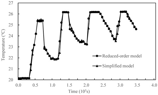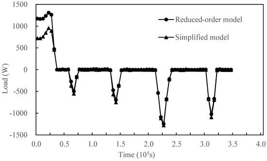 After determining the optimal order, the simplified model obtained in the previous section was used to verify the accuracy of the reduced-order model. Using the same meteorological preprocessing model, the reduced-order model was compared with the corresponding simplified model. Taking a set of tests as an example, the meteorological data for four days (1 June–4 June) were arbitrarily selected, and the indoor air temperature comparison chart shown in Figure 9 was obtained. The two curves are very close in the ascending stage, and the difference can be seen in the descending stage; the maximum temperature difference is only 0.33 °C. Figure 10 compares the load values predicted by the reduced-order and simplified models. It can be seen that the simulation results of the two models are very consistent. However, there is a large error in the initial stage because the initialization of the reduced-order model has no physical meaning, and there is no way to define the initial temperature. Equilibrium can only be gradually reached in the calculation.