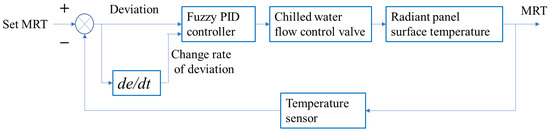 In the radiant air conditioner plus independent fresh air system as the controlled object, fuzzy PID (proportional-integral-derivative) control, which is common in HVAC systems [34,35], was used. The surface temperature of the radiant panel was controlled by adjusting the opening of the chilled water flow control valve, so that the MRT was consistent with the set value; the air supply volume was adjusted by controlling the fan inverter, so that the indoor fresh air volume and humidity were consistent with the set value. Taking the specific control process of the surface temperature of the radiant panel as an example, when the calculated MRT value deviated from the set value, the opening of the chilled water valve was controlled by changing the voltage, thereby adjusting the chilled water flow. The heat exchange between the radiant panel and the chilled water was changed to adjust the surface temperature of the radiant panel. The radiant heat exchange between the radiant panel and the indoor environment was changed to adjust the temperature of the air-conditioned room. The voltage adjustment range was 0–10 V, the linear corresponding temperature change range was 0–100 °C, and the frequency change range of the inverter was 0–50 Hz. The fuzzy PID control system is shown in Figure 12.