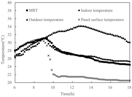 Figure 13, Figure 14 and Figure 15 show the changes in the MRT, indoor temperature, and radiant panel surface temperature with time under different control methods. Figure 12 shows the change process for each temperature under constant working conditions. Before the start of the air conditioning system in the morning, as the outdoor air temperature gradually increased, both the indoor air temperature and the MRT increased to 31 °C. After the air conditioning system was started, the temperature of the radiant panel dropped rapidly, and the indoor air temperature and MRT gradually decreased and stabilized under the action of radiation and convection heat transfer. After 13:00, the outdoor temperature continued to increase to 30 °C, and the temperature difference with the highest temperature reached 4 °C. Since the chilled water flow and temperature remained unchanged, the cooling capacity provided by the air conditioning system was excessive, resulting in a continual decrease in the indoor air temperature and MRT. It can be seen that during the entire change process of the indoor air temperature and MRT, the indoor air temperature could also drop rapidly due to the forced convection of the mixed wind when the air conditioning system activated. However, after the indoor thermal environment stabilized, the load changed, the MRT continued to decrease, and the indoor temperature remained unchanged. When the outdoor temperature dropped significantly in the afternoon, the indoor temperature dropped from 27 °C to 26 °C between 13:00 and 18:00. The MRT decreased from 27 °C to 25 °C, and the magnitude and speed of the decline were greater than the indoor air temperature. This occurred mainly because the surface temperature of the east outer wall, which was in contact with the outdoor environment, was directly affected by the decrease in outdoor air temperature. Since the heat exchange with the outdoor environment was reduced, the surface temperature of the east outer wall decreased accordingly. Although constant operating condition control cannot maintain the indoor thermal environment when the air conditioning load changes significantly, the experimental results indicate that the MRT response to load changes was greater than the indoor air temperature under the same conditions. The air conditioning system can be adjusted in a timely manner for load changes using the MRT as a control parameter to feed back to the control system.