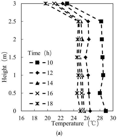 Figure 17. Temperature distribution in the vertical direction. (a) Vertical temperature distribution under constant condition control; (b) vertical temperature distribution under constant flow control; (c) vertical temperature distribution under constant temperature control.