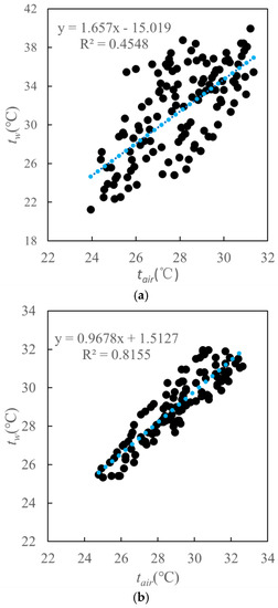 Figure 18 shows the relationship between the indoor air temperature tair and the surface temperature of each envelope tw when the air conditioning system is activated in the summer. It can be seen that the relationship between the surface temperature and indoor air temperature of the east outer wall was not very obvious, owing to the influences of solar radiation and the outdoor environment. However, there was a good linear relationship between the surface temperature of the south inner wall, west inner wall, and north inner wall, with the indoor air temperature. From this, an approximate relationship between the indoor air temperature and inner surface temperature of the envelope was obtained, as follows: