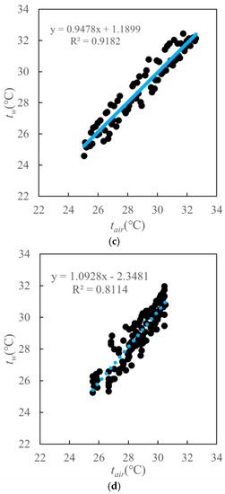 Figure 18. Relationships between indoor air temperature and surface temperature of each envelope. (a) Linear fitting of the surface temperature of the eastern inner wall and indoor air temperature; (b) linear fitting of the surface temperature of the south inner wall and indoor air temperature; (c) linear fitting of the surface temperature of the west inner wall and indoor air temperature; (d) linear fitting of the surface temperature of the north inner wall and indoor air temperature.