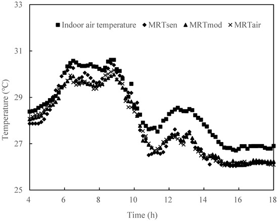 The angle coefficients of each enclosure structure where the feedback signal collection point was located were all less than 0.16. Therefore, when the surface temperature of the envelope structure is not significantly different from the indoor air temperature, it is assumed that the surface temperature of the envelope structure is equal to the indoor air temperature, and will not have a significant influence on the accuracy of the MRT prediction. Except for the surface temperature of the floor with a large angle coefficient, for the east outer wall that is greatly affected by solar radiation, and the surface temperature of the ceiling that is greatly affected by the air conditioning system, the MRT calculated by the prediction model for the surface temperature of other envelope structures was recorded as MRTmod. When the surface temperatures of other envelope structures were regarded as equal to the indoor air temperature, the MRT was recorded as MRTair. When all envelope surface temperatures were measured by sensors, the MRT was recorded as MRTsen. Figure 19 shows a comparison of the results obtained using the three MRT calculation methods. It can be seen that at 6:00, 9:00 and 11:00, the indoor air temperature varied greatly. MRTair failed to reflect the inertia of indoor air temperature change over time, which was 0.5 °C different from MRTsen. During the stabilization process at each temperature, the difference between MRTmod and MRTsen did not exceed 0.2 °C, which is closer to the measured results than MRTair, showing higher accuracy. Overall, there was little difference between the three MRT results; the change trend and process were consistent, and the error was less than 5%. It can be seen that it is feasible to establish an MRT prediction model to simplify the calculation method for the control system.