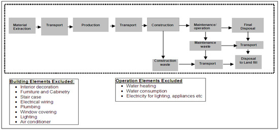 - Cuéllar-Franca, R.M.; Azapagic, A. Environmental impacts of the UK residential sector: Life cycle assessment of houses. Build. Environ. 2012, 54, 86–99. [Google Scholar] [CrossRef]