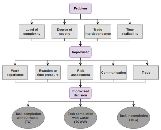 Although construction is known to comprise ubiquitous uncertain, dynamic, and highly variable circumstances [13,14], few studies have attempted to address the phenomenon of improvisation in construction. A previous research study has defined improvisation in construction as a deliberate decision-making process that is usually used when speed is required to meet a deadline, planned procedures fail to meet the requirements, pre-planned strategies fail to manage a sudden problem, and standardized procedures fail to catch up with daily ameliorations and progress [8]. Another study has modeled improvisation in construction as a decision-making process and explained its different stages [15]. Moreover, one study described the act of improvising as having to change the location, task, or work method as a result of disruption in the jobsite [16].