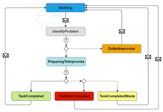 Next, corresponding behavioral states during improvisation were determined. Each improviser completes a decision-making process to generate an improvised outcome when a problem requiring improvisational efforts occurs. Figure 2 shows the state chart of an improviser in the simulation model. Initially, an improviser is in the “Working” state. When an issue arises, they move into a state of “Identifying the problem”, during which they analyze the problem at hand. Based on the analysis, they either identify the need to improvise, which is the “Preparing for an improvised decision” state, or they fail to identify the need to improvise and go back to “Working”. After preparing for improvisation, an improviser’s decisions may solve the problem with (TCWW) or without (TC) producing waste, or they might not solve the problem (TNC).