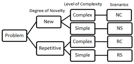 Problems that require improvisational efforts to be resolved in a construction project are modeled as agents forming an agent group or population. In reference to the conceptual model, such problems have a set of criteria that determines its significance or complication. These criteria are: level of complexity, degree of novelty, trade interdependence, and time availability. Analysis of the time needed for an improviser to solve different types of problems is out of the study’s scope. Hence, the model does not consider the “time availability” as a parameter for a problem that requires improvisation. Instead, the model assumes that all problems impose the same time pressure on improvisers to come up with a solution. The author considers the degree of novelty and level of complexity as classification criteria to differentiate between different types of problems. For the degree of novelty, problems that never happened before are classified as “New”; however, in cases where similar problems or instances happened during past operations, problems are considered to be “Repetitive”. Regarding level of complexity, problems are categorized in the model into either “Simple” or “Complex”. Therefore, according to such classification, the possible types of problems are new and complex (NC), new and simple (NS), repetitive and complex (RC), and repetitive and simple (RS), as shown in Figure 3.