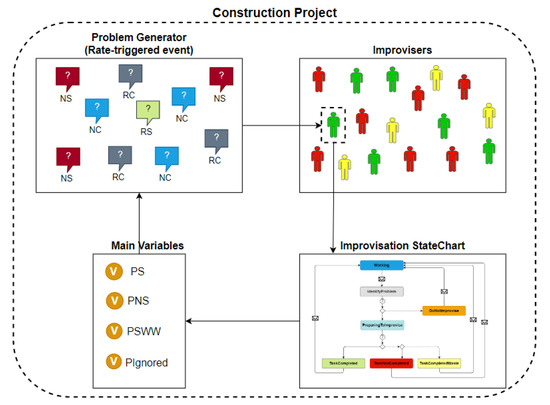 The main environment includes the agent groups, variables, parameters, events, collections, and plots necessary for the model’s rationale and setup. The main environment of the proposed model is a construction project in which all improvisers work and interact together, and different types of problems are generated.