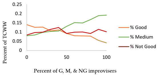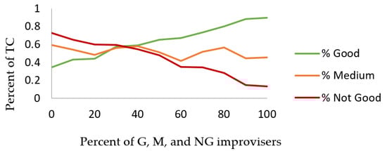 The percent of TC is nearly 50% when all improvisers are of “M” type (i.e., the percentages of G and NG improvisers are zero). As the percent of G improvisers increases by increments of 10% while holding that of NG improvisers constant, the percentage of TC increases by around 4.5%. For every 10% increment increase in the population of NG improvisers, while keeping the proportion of G improvisers constant, the percent of TC decreases by around 3%. Therefore, the impact of being a G improviser is slightly higher than that of being an NG improviser.
