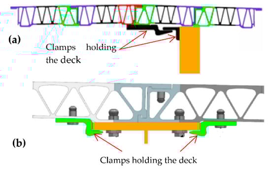 Figure 2b). The connections between the aluminum deck and the steel girders or the glulam beams are designed (