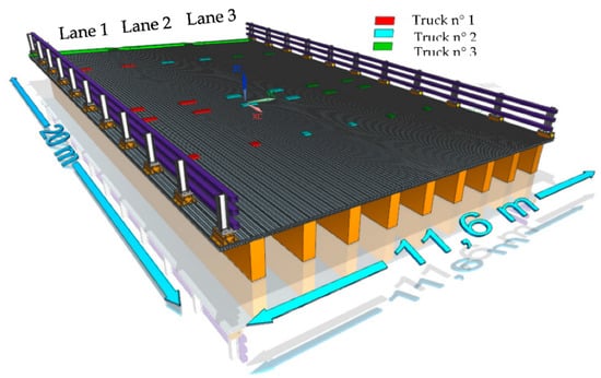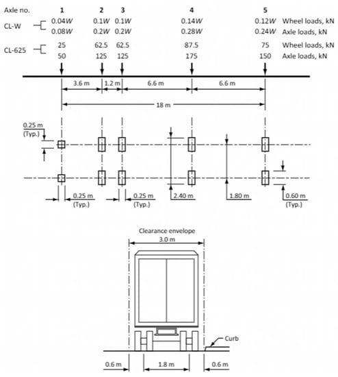 Figure 4 illustrates the location of the tire print for the CL-625 truck loads for each lane of the studied bridge (a total of three CL-625 trucks). The wheel and axle loads as well as the axle spacing for the CL-625 truck according to the CHBDC Standard are given in