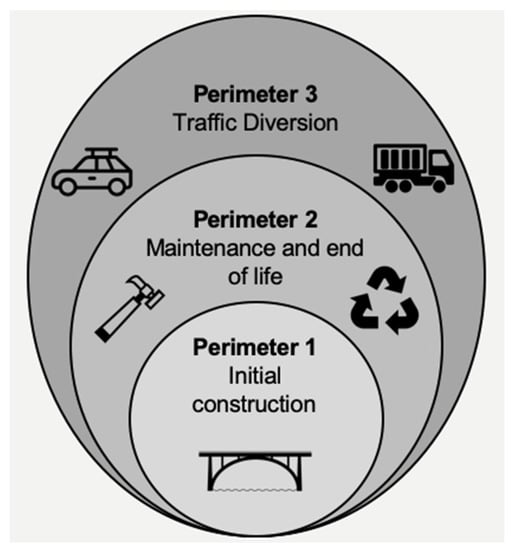 The first perimeter, Initial Construction, is included in the second perimeter, Maintenance and End-of-Life, which, in turn, is included in the third perimeter, Traffic Diversion.