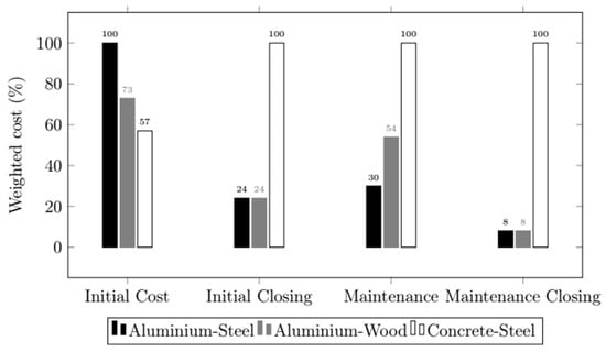 In an urban setting, the study results show a 4% reduction in the total life cycle cost for an aluminum/wood deck compared to an aluminum/steel bridge in the case of a bridge rehabilitation with an initial road closure. This cost reduction is 8% in the case of a new bridge construction without an initial road closure. The use of wood framing and the optimization of the aluminum deck reduce the initial construction cost by 30% compared to an aluminum/steel structure. The difference is subsequently reduced due to maintenance operations on the wooden elements. As a result, the breakdown of the overall cost between the construction and service phases is 70%–30% for the aluminum/steel deck compared to 68%–32% for the aluminum/wood deck in the case with an initial road closure. In both configurations, the importance of indirect costs related to road closures is noteworthy. Indeed, in both cases, nearly 80% of the overall life cycle costs are generated exclusively by indirect costs. In the case of the aluminum/steel deck, the indirect cost of the initial closure represents 51% of the total cost, and the indirect cost of the road closure related to maintenance operations represents 28%. In the case of the aluminum/glulam timber deck, this represents 53% and 29% of the total cost of the deck, respectively. These two alternative aluminum deck solutions are then compared to the conventional concrete-slabs-on-steel-beams solution. The results of the life cycle cost study are summarized in