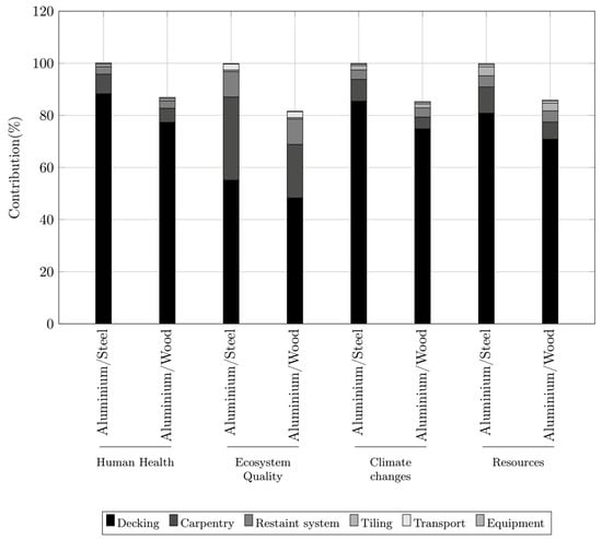 www.openlca.org, accessed on 25 June 2020). An example of a basic process is the production of aluminum decking. For each process, the database provides the elementary flows. These are defined as the material or energy entering the elementary process that has been taken from the environment without prior human transformation (water, gas, etc.) and the material or energy leaving the process that is released into the environment without further human transformation (waste, heat or gas emissions). Knowledge of these elementary flows and, therefore, of the elementary processes is provided by the life cycle inventory. This corresponds to the balance of the elementary flows, i.e., the resources extracted from the environment and the pollutants emitted into the environment. This same life cycle inventory is then used to carry out the environmental life cycle analysis. It is therefore a matter of translating the emissions from the inventory into the results of impact category indicators using characterization factors. The choice of impact categories must reflect a complete set of environmental problems related to the deck system studied. Several methods exist for carrying out the environmental impact assessment. These essentially differ in their analytical framework, their characterization model and their parameterization. The method used here is the European IMPACT 2002+ method [