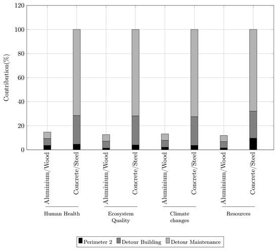 The recycling of glulam wood elements at the end of their life cycle reduces the environmental impact of this bridge by 24% over its entire life cycle. Finally, it appears once again that traffic diversions are at the root of the increase in the environmental impacts of the two deck solutions, since they account for nearly 86% of the total environmental impacts for both deck systems. Thus, the environmental impacts of the two decks over their entire life cycle are relatively similar due to the identical scenario of road closures for construction and maintenance. Conversely, the differences widen when comparing the alternative deck systems to the conventional deck solution. Although the environmental impacts of the conventional deck are lower during construction than those of an alternative aluminum/wood deck (reduction of 75% or even 5% depending on the category of damages), the trend reverses as soon as maintenance operations and end-of-life management are considered. In addition, there are the environmental impacts related to traffic diversions. Consequently, the use of an aluminum/wood deck reduces the overall environmental impact by 85% to 88%, depending on the damage category, compared to the environmental impact of a conventional concrete/steel solution, as shown in