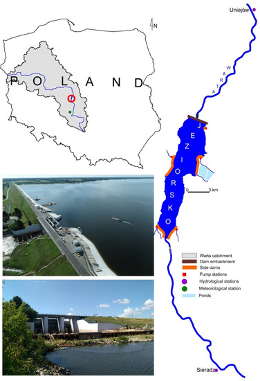 Warta is the third longest river in Poland (808.2 km) with a catchment area of 54,519.6 km2. Its headwater section has a character of an upland river. In the subsequent section it is a lowland river. Its maximum flows occur in the period of summer floods, although statistically, high stages usually predominate in the spring period after snowmelt. The average unitary outflow for the Warta River in the zone above the Jeziorsko reservoir is approximately 5.2 dm3 s−1 km−2, and the average annual flows for the nearest water gauge cross-section Sieradz above the reservoir are at a level of 25–75 m3 s−1. The minimum recorded flow was less than 10.0 m3 s−1, and the maximum 408.0 m3 s−1 (based on the data of IMGW-PIB). Considering such variable flows at the multi-annual and seasonal scale in the 1970’s, a decision was made to build the reservoir in the middle course of the river (on km 484.3). In 1986, a reservoir was commissioned, called Jeziorsko after a nearby municipality (Figure 1). It closes the catchment of the Warta River with an area of 9012.6 km2. The basic tasks of the reservoir include: reduction of flood threat in the Warta River valley below the reservoir through the reduction of floods; shaping water resources in the Warta River valley through controlling water flow in the scope of low and high flows; guaranteeing the base flow below the reservoir; guaranteeing water for industrial plants in the region of the Middle Warta River, meeting potential water supply needs of the municipal engineering, use of retained water for irrigations in agriculture, improvement of navigation conditions on the navigable sections of the Warta River, electricity production in a hydraulic power plant at the dam embankment, development of recreation and tourism around the reservoir, conducting fishery economy, and maintenance of habitat conditions for waterfowl (in the upper part of the reservoir).