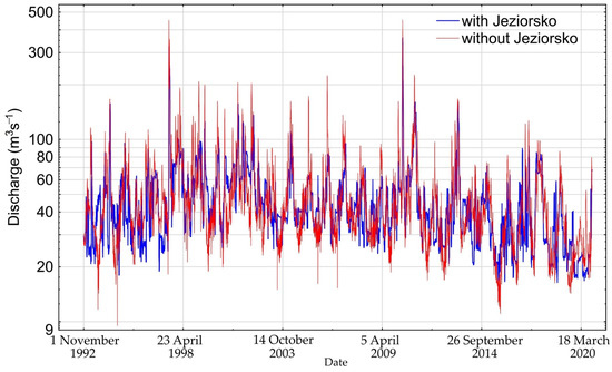 Water flows in water gauge cross-section Uniejów in the years 1993–2020, both actual and hypothetical in a situation in which the Jeziorsko dam reservoir had never been built are presented in Figure 2.