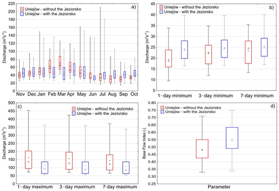 The construction of the Jeziorsko reservoir also substantially contributed to an increase in 1-, 3- and 7-day minimum flows (Figure 3b). The reservoir also contributes to a decrease in maximum flows in the Warta River (Figure 3c). The effect of the reservoir is the greatest in reference to 1-day flows, and the lowest for 7-day flows in reference to minimum flows. In the case of maximum flows, the effect of the reservoir is the same for 1-, 3-, and 7-day maximum flows. The functioning of the reservoir is of greater importance in the case of reduction of maximum flows than minimum flows. The Jeziorsko dam reservoir also contributes to an increase in the characteristics of the base flow index (Figure 3d).