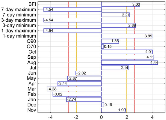 The results of the trend analysis of air temperature and precipitation provide the climatic background for the reported flow changes. The results show an increasing trend of average annual air temperatures at the Wieluń station at 0.6 °C per decade (Table 3). Also in November, December, June and August significant increases in air temperature were observed in a range of 0.6 to 1.4 °C per decade. There was a generally upward tendency in air temperatures in the other months as well. Only in January and May there was a downward tendency of −0.1 and −0.3 °C per decade, respectively. Analysis of precipitation showed that the changes were not statistically significant over the 1993–2020. With regard to the values of annual precipitation, there was a downward tendency at −48 mm per decade. Also in November, December, February, March, April, May, July and August, there was a tendency to decrease precipitation at −9 to −4 mm per decade. There was a slight upward tendency in the remaining months.