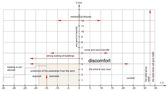 | Average Air Temperature in the Season of Discomfort | Average Wind Speed, M/S, in the Period with an Average Daily Air Temperature ≤ 8 °C | Prevailing Wind Direction in December–February |