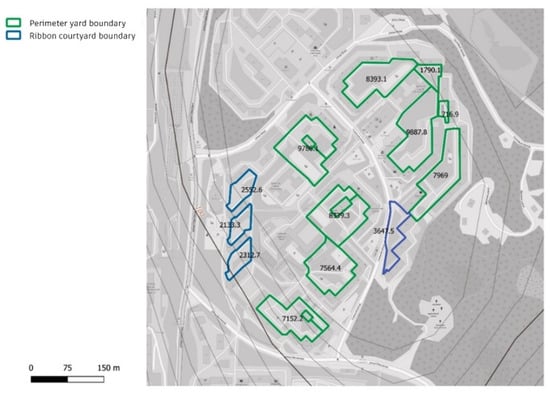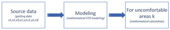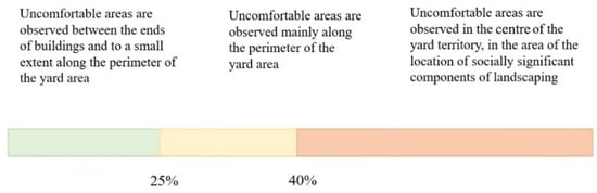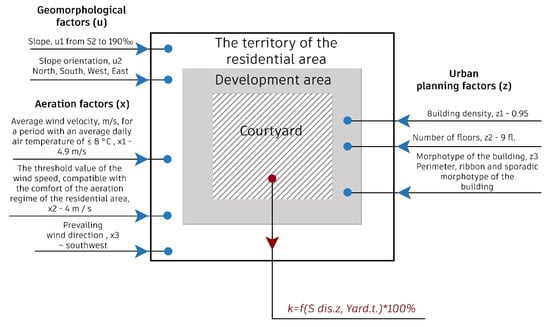 - Level 3—courtyard area—optimization parameter k, obtained in the process of simulating Level 1 and Level 2 parameters and parameter Y (area S of discomfortable zones).