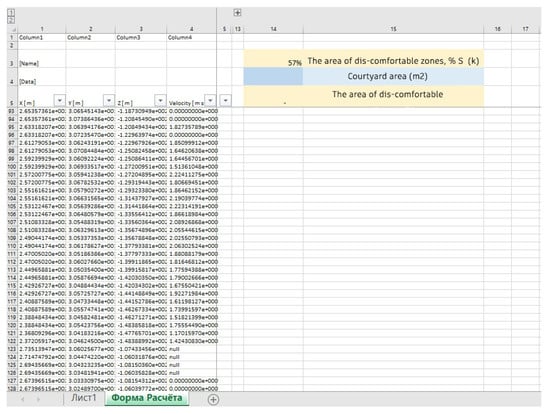 - The database in the .csv format, which has coordinates of each point of the development in the XY plane limited by the courtyard area, is downloaded from ANSYS Fluent and uploaded to the .xls file. The value of the wind velocity, determined by means of numerical simulation, is assigned to each point.