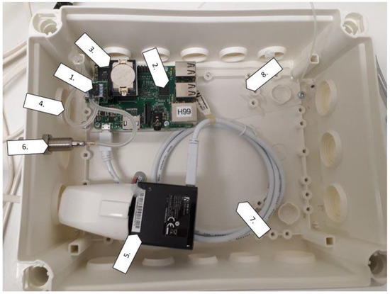 The air pressure difference measurement unit inside an installation box. 1. Differential pressure transmitter (Honeywell TruStability). 2. Raspberry Pi 2 model B. 3. Clock timer. 4. Flexible tube for differential pressure transmitter (indoor air conditions). 5. Power adapter for Raspberry Pi. 6. A coupler for different diameter tubes (outdoor air conditions). 7. Protective casing for the device. 8. Connection board (transparent plastic) to fix the equipment to the casing.