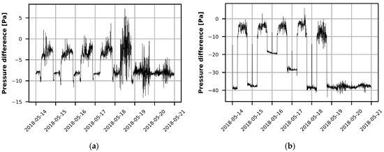 Examples of regularly varying air pressure differences between 14 and 21 May 2018. Air pressure differences were strongly controlled by the mechanical ventilation. Typically, the air pressure difference was smaller (closer to zero) during daytime and larger during weeknights and weekends. (a) Small underpressure with steady pattern; (b) large underpressure during weeknights and weekends with changing pattern during weeknights.