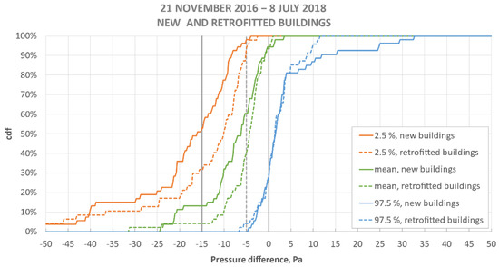 A comparison of air pressure differences for new and retrofitted buildings is presented in Figure 4. The cumulative distribution functions (cdf) represent the 2.5% cdf values, arithmetic means, and 97.5% cdf values calculated from all the measurement points and from the full final time series. The bold vertical lines in Figure 4 show the national guidelines for air pressure differences according to Ch. 1.2 (−15 Pa, −5 Pa, and 0 Pa).