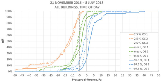 The medians of means in operating situations OS 1–OS 3 were −3.7 Pa, −6.3 Pa, and −5.8 Pa, which are relatively close to each other. However, a larger difference between weekdays and weeknights/weekends in the 2.5% cdf values could be noticed.