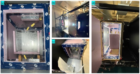 To calculate the average incident radiant energy from the solar-simulated light provided by the lamp, the plexiglass at the front of the Trombe wall prototype was considered to be divided into equal areas in a 3 × 3 mesh. The incident light intensity was then measured at the center of each of the nine areas in the mesh using a power meter (THORLABS, PM 100D), and the average of these measurements, which was 44.4 mW/cm2, was taken as the average incident radiation. The time used to calculate was five hours, which was the time during which the lamp was on during the charging phase. The area of the acrylic sheet at the front of the Trombe wall prototype (57.2 cm × 43.2 cm = 2468 cm2) was used as the area in Equation (5).